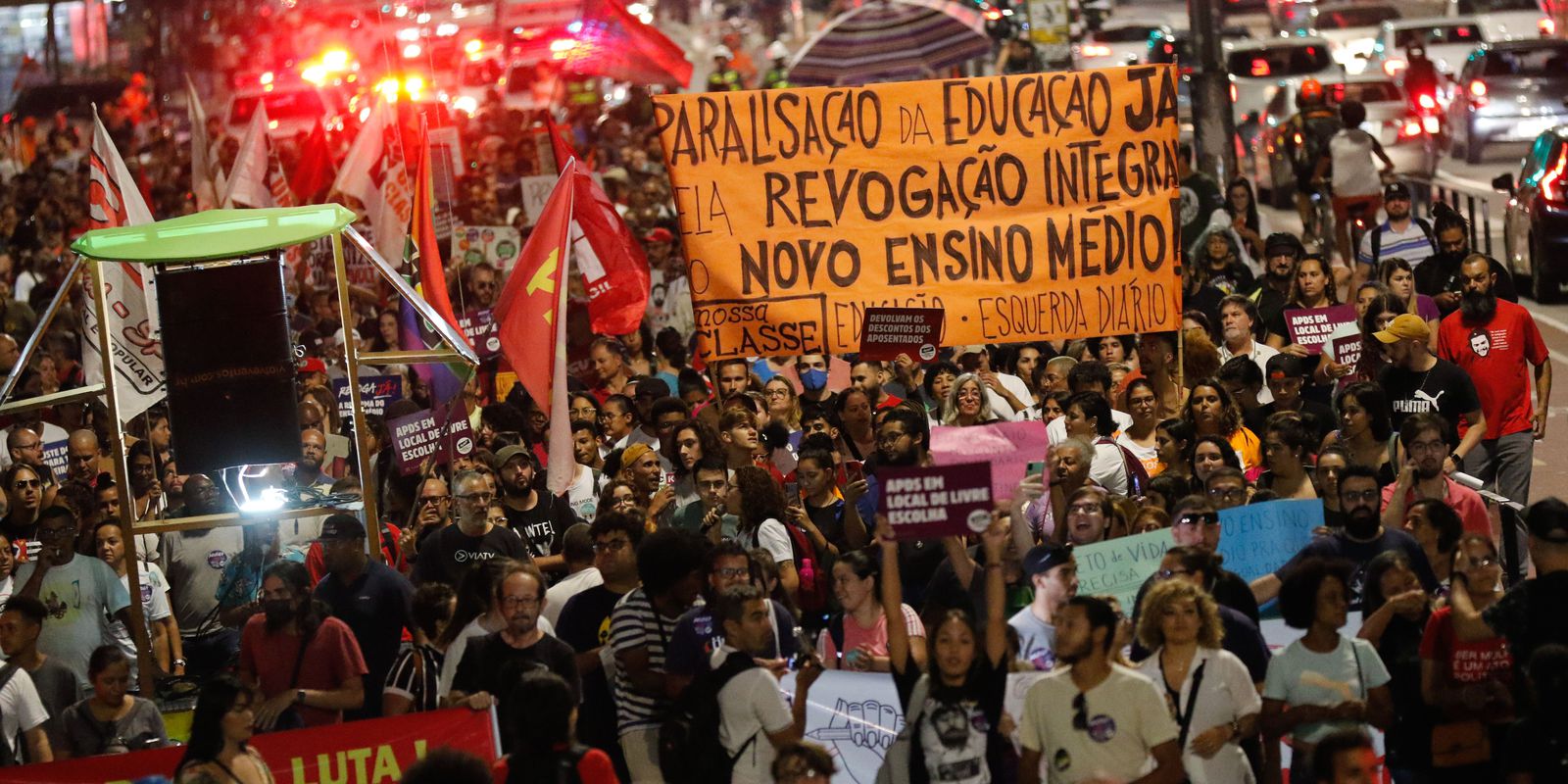 Professores e alunos fizeram, no final da tarde de hoje (22), uma manifestação na capital paulista contra a atual política do ensino médio, implementada pela Lei 13.415, de 2017, conhecida como o novo ensino médio. O ato ocorreu em frente ao Museu de Arte de São Paulo (Masp), na Avenida Paulista. Todas as faixas de trânsito de veículos no local foram ocupadas pelos manifestantes.