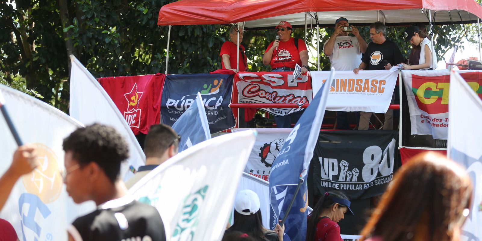 Os manifestantes de diferentes idades empunharam bandeiras e vestiram camisetas de movimentos sociais, partidos políticos e em defesa da democracia brasileira. Já os líderes sindicais se revezaram nos microfones para dialogar com os trabalhadores e protestar, durante a manhã, nos intervalos das apresentações artísticas de forró e de rap.