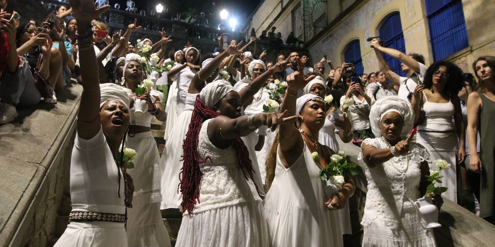 Vestidas de branco e tocando tambores, as mulheres do bloco afro Ilú Obá de Min realizaram na noite desta terça-feira (13) a tradicional lavagem da Escadaria do Bixiga, espalhando água de cheiro.